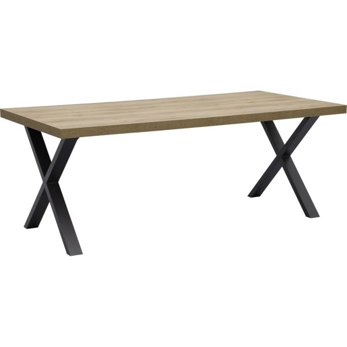 Eettafel Renzo is een eigentijdse stijlvolle tafel bij budget home Store. De slanke zwart metalen kruispoot aan het uiteinde van het tafelblad geeft een speels karakter. Het blad is afgewerkt in melamine in de frisse houttint Arizona Oak. Het melamine is een sterk materiaal. Het lijkt op echt hardhout maar is krasvast en onderhoudsvrij. Zeker ideaal voor het gezin of als je geen onderhoud aan je meubels wilt. Het design van eettafel Renzo staat prachtig in een modern of strak industrieel interieur. De tafel is verkrijgbaar in 3 maten: zoek je een kleine tafel maar toch plek voor 4 mensen? Dan is de 170cm een mooi formaat voor in jouw keuken of als je een niet al te grote eethoek hebt. Een fijne mogelijkheid is, om bijvoorbeeld het verlengstuk erbij te nemen. Dan heb je de standaard maat van 170cm, maar als er momenten zijn dat je net even wat meer ruimte nodig hebt aan je tafel, dan kan je het tafelverlengstuk Renzo van 50cm eraan zetten. Handig! Zoek je ook bijpassende eetkamerstoelen? Bekijk ons ruimte assortiment, ook te vinden op deze website. Er zijn meerdere meubelen van de woonstijl Renzo, bekijk bijvoorbeeld het bijpassende dressoir of opbergkast. De eettafel Renzo kan je direct bestellen in onze webshop. Wil je het product liever even bekijken en de andere meubelen ook zien? Kom dan naar één van onze Budget Home Stores. De dichtstbijzijnde winkel vind je op onze vestigingspagina.