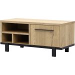 Tv-meubel Wilson is een moderne tv-kast van 112 cm breed en is voorzien van een luxe softclosesysteem. Tv-meubel Wilson heeft 3 open vakken en 2 vakken met vaste planken achter de deur. Daardoor is deze multifunctionele lage wandkast van Budget Home Store ook een ideale opbergkast. Het design van de lage televisiekast (50 cm) is strak en eigentijds. Tv-meubel Wilson heeft een zwart stalen frame (kastpootjes 11,5 cm hoog) en handgrepen en is afgewerkt met melamine in lichte houtlook. Melamine is een sterke kunststoflaag die eruit ziet en voelt als massief hout. Een melamine kast biedt jou een aantal voordelen. De tv-kast van Budget Home Store oogt hierdoor als tv-meubel van hout, is behoorlijk krasvast, werkt niet en makkelijk schoon te maken met een vochtige doek. Het prettige van de softclose op de deur is dat die altijd rustig sluiten. Zoek op Wilson om het grote tv-meubel en andere kasten uit deze meubelserie van Budget Home Store te zien. De tv-kast wordt gemonteerd geleverd.
